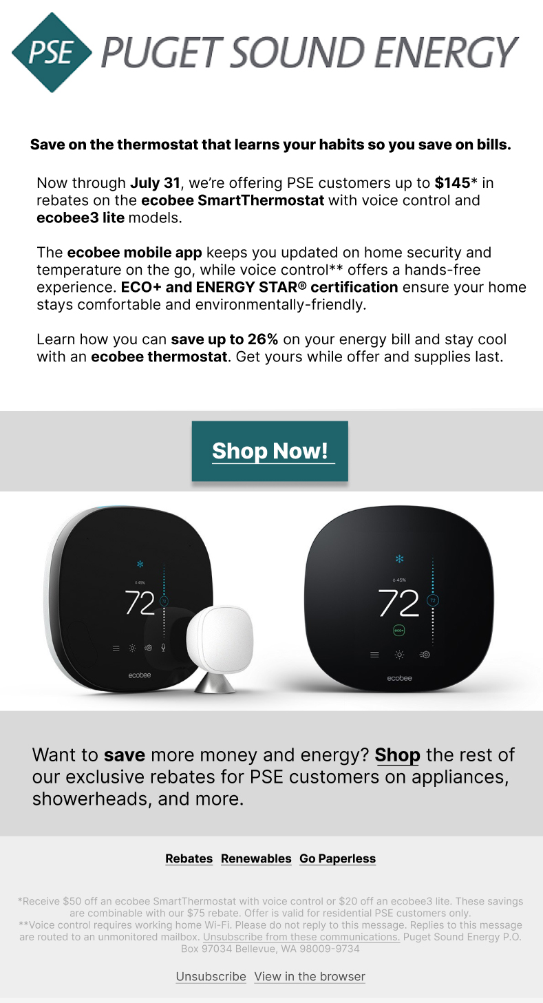 Puget Sound Energy (PSE) needed to inform their customers of the convenience and energy savings of buying an ecobee smart thermostat using a rebate. I was given this assignment for an interview.